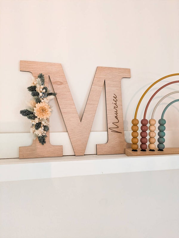 Kies voor een natuurlijke, strakke look zonder versiering of laat je letter afwerken met een subtiel boeketje droogbloemen in een kleurcombinatie naar keuze.