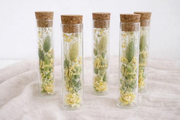 Je maakt 6 geluksbuisjes met droogbloemen, perfect als originele bedankjes voor gasten. incl. stickers met naam!