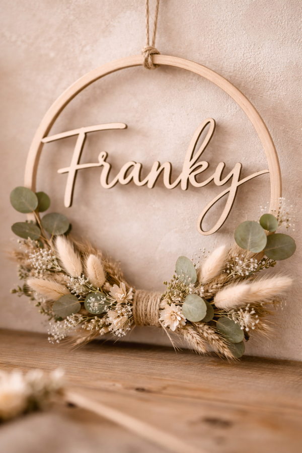 Een prachtige flowerhoop afgewerkt met droogbloemen en een naam of tekst naar keuze. Perfect als decoratie voor een communie- of lentefeest.